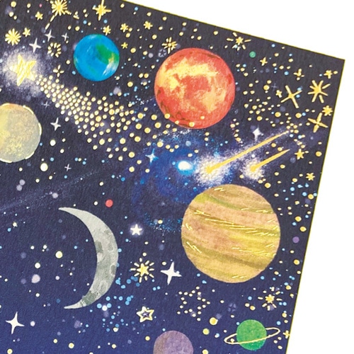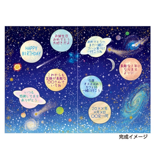 未来への無限の広がりと煌めく星々を描いた宇宙柄のカードは、退職や卒業など人生の新たなステージへ旅立つ方へ「成功を祈る」応援の気持ちを込めて贈るのに ぴったりな1枚です。宇宙柄は新しい始まりと成長を意味するので、もちろん誕生日祝いにもお使いいただけます。シール8片付き【検索ハッシュタグ】#チキュウ#寄せ書き#色紙#少人数#宇宙