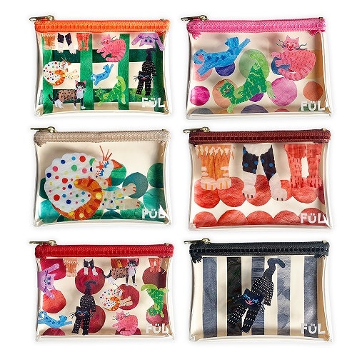 塗って切って貼って・・・ひとつひとつコラージュから生まれたネコちゃん達で、6柄すべてオリジナルのデザインポーチとなります。ファスナー色も異なり、小さな小物を入れるのにピッタリです。
