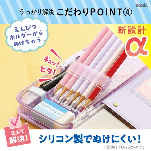 鉛筆の削り忘れや入れ忘れ、消しゴムが無い!…そんなうっかりを1か所チェックで解決!えんぴつチェックα両面筆入 フタを開けずに、外側から鉛筆の芯先が見える設計で、フタを閉じたままでも鉛筆の削り忘れや入れ忘れのチェックができる 筆入の蓋が開いて中身が飛び出しちゃう。を解決する、両面ロック機能付き。簡単操作で開閉をロック!シリコン製の鉛筆ホルダーで、軽く差し込むだけで、走って揺れてもしっかり鉛筆をホールド!最薄クラスのスリムボディーでランドセルへは横向きにも、前ポケットにも、スキ間へスッキリ収納!しかも頑丈!裂けに強いメッシュ+PVCの2層構造「Wシート補強」で開閉耐久UP!授業のことを考えて、鉛筆は5教科分+赤鉛筆の合計6本収納できるペンホルダー 大容量、小学校の標準的な筆入の中身の持ち物リストに対応 付属の鉛筆削りは外から削りカスが見えるので「うっかり捨て忘れ」も防ぎ、鉛筆削りが不要の場合は取り外しができる シンプルデザインの無地タイプ(華美なデザイン禁止の学校でも使いやすい)【検索ハッシュタグ】#小学生#学童#学用品#新入学#入学準備#筆箱#忘れ物#ADHD#発達障害#ロック#アルロック#両面#大容量#男の子#かっこいい#女の子#かわいい#シンプル#うかサポ#うっかり#発達凹凸#改良#丈夫