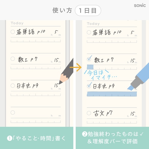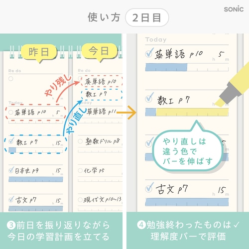 1日たった2分で「やること」「ニガテ」を一目瞭然に!100日分の勉強リスト 勉強机の上など目のつくところにスタンドさせておけば、「やること」常に確認しながら勉強できる 表紙が留められるバンド付で、持ち運びにも◎ 内側のバンドにページを挟んでおけば、しおり代わりにも 「やること・時間」書くだけ!サクッとリスト化で勉強をスムーズに始められる 「昨日」と「今日」のページが見れる2連のメモ 前日の振り返りをしながら、学習計画を立てよう 「やること」の下にある「理解度バー」は、マーカーでバーをひいてニガテを見える化!伸びしろが大きい所から効率的にやり直せる ふせん付き(約100枚入) 分からない問題はとりあえずふせんを貼って飛ばす→後日、先生に確認で脱ダラダラ勉 【サイズ】A5変形(約 H190×W148mm)【ページ数】100ページ
