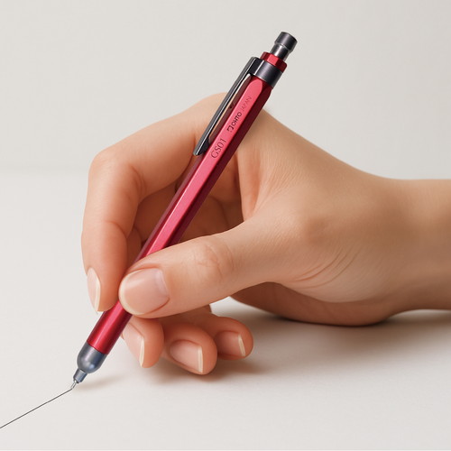 速乾でなめらかなゲルインクに視認性の高いニードルチップを搭載し、六角から丸軸へ移行するアルミボディが握りやすさとデザイン性を両立しています。フルメタルならではの重厚感を備えた一本です。