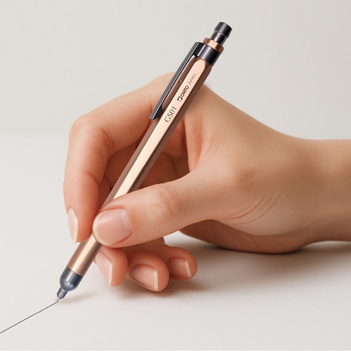 速乾でなめらかなゲルインクに視認性の高いニードルチップを搭載し、六角から丸軸へ移行するアルミボディが握りやすさとデザイン性を両立しています。フルメタルならではの重厚感を備えた一本です。