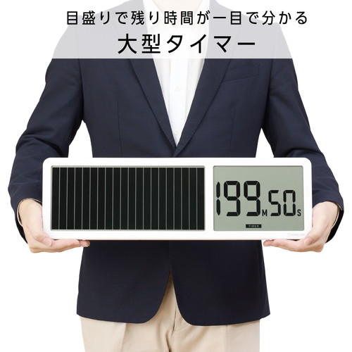 バーの目盛りで残り時間が一目で分かる大型タイマーです。通常計測モードとリピート計測モード、時計モードの選べる3つのモードを搭載。