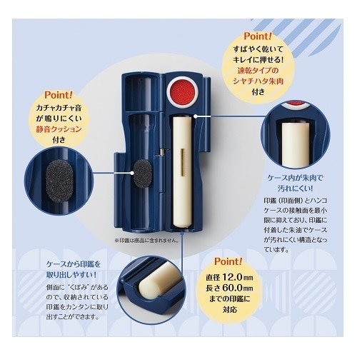 直径12.0mm×長さ60.0mm以内の印鑑が1本収納可能。蓋を開けた時180度で止まり、印鑑が飛び出しにくい構造です。持ち運び時にカチャカチャ音が鳴りにくい静音クッション付き。すばやく乾いてキレイに捺せる速乾タイプのシヤチハタ朱肉を採用しています。【検索ハッシュタグ】#