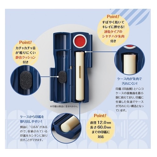 直径12.0mm×長さ60.0mm以内の印鑑が1本収納可能。蓋を開けた時180度で止まり、印鑑が飛び出しにくい構造です。持ち運び時にカチャカチャ音が鳴りにくい静音クッション付き。すばやく乾いてキレイに捺せる速乾タイプのシヤチハタ朱肉を採用しています。【検索ハッシュタグ】#