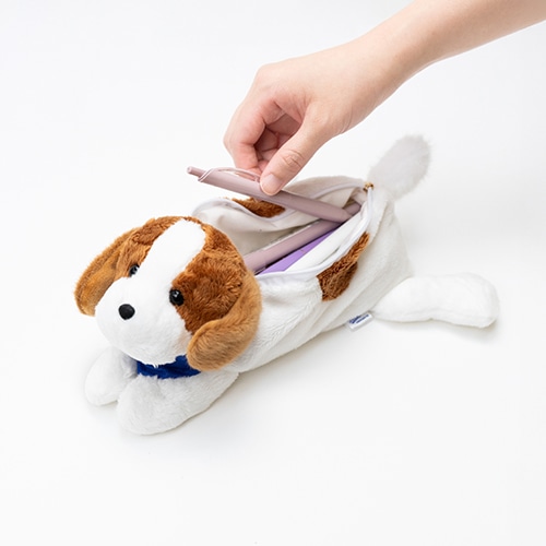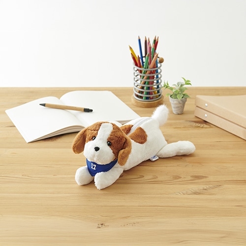 ●背中のファスナーが大きく開いてたっぷり入る、ちょこんと見守るデコピンが、勉強もお仕事も応援中●かわいい見た目でたっぷり入る実力派 直径10mmのペンが約15本入ります(大きさや形状によって異なる場合があります)●首元の青いバンダナがチャームポイント●メイクやガジェットポーチにも使える