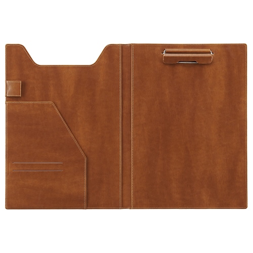 ●A4判E型のクリップファイル●表紙は360度折り返せるので、立ったままの筆記でも書き込みしやすい●名刺やメモが入れられる内ポケット付き●便利なペンホルダー付き●高級感のある合皮製●書類約50枚収容可能