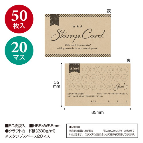 リピーター獲得に最適なスタンプカードです。飲食店やサロン、各種店舗で使いやすいデザインで、販促ツールとして幅広く活用できます。クラフトの厚手用紙で扱いやすく、集客力アップに貢献します。スタンプスペース20マス。