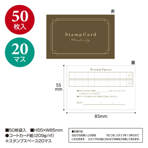 リピーター獲得に最適なスタンプカードです。飲食店やサロン、各種店舗で使いやすいデザインで、販促ツールとして幅広く活用できます。厚手の用紙で扱いやすく、集客力アップに貢献します。スタンプスペース20マス。