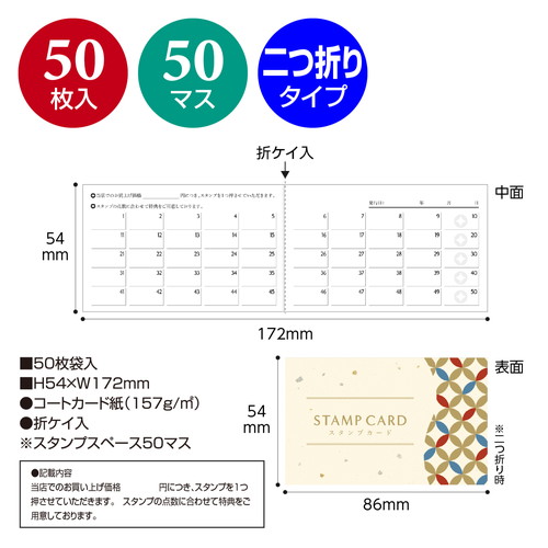 リピーター獲得に最適なスタンプカードです。飲食店やサロン、各種店舗で使いやすいデザインで、販促ツールとして幅広く活用できます。厚手の用紙二つ折りタイプで扱いやすく、集客力アップに貢献します。スタンプスペース50マス。