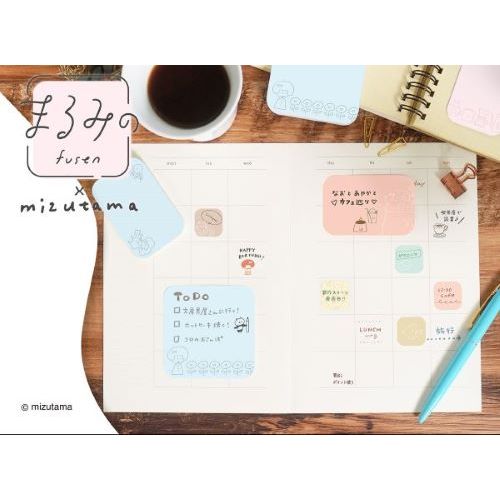 まるみのがmizutamaコラボ絵柄で登場です。スウィーツを楽しむ時間のような甘く優しいカラーの4色が1冊になって好きな色から使えます。シンプルで使いやすく、手帳に使ってもおしゃれにまとまり、簡単なデコから上級者アレンジまでが可能です。