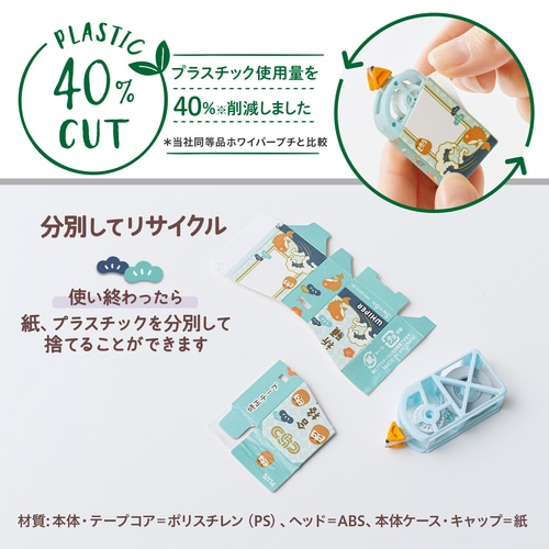 ●受験生へ応援の気持ちを込め、お守りや縁起物をモチーフにしたデザイン●本体に応援メッセージ記入スペースがあり、勉強中にいつでも見返せます ●プラスチック使用量を40%削減※当社ホワイパープチと比較●紙、プラスチックを分別して廃棄ができます●箱型形状でコンパクトサイズなので、持ち運びにも 収納にも優れています●薄さらテープとミニローラーを搭載で、いつもの使い心地