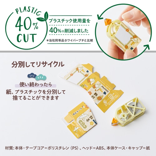 ●受験生へ応援の気持ちを込め、お守りや縁起物をモチーフにしたデザイン●本体に応援メッセージ記入スペースがあり、勉強中にいつでも見返せます ●プラスチック使用量を40%削減※当社ホワイパープチと比較●紙、プラスチックを分別して廃棄ができます●箱型形状でコンパクトサイズなので、持ち運びにも 収納にも優れています●薄さらテープとミニローラーを搭載で、いつもの使い心地