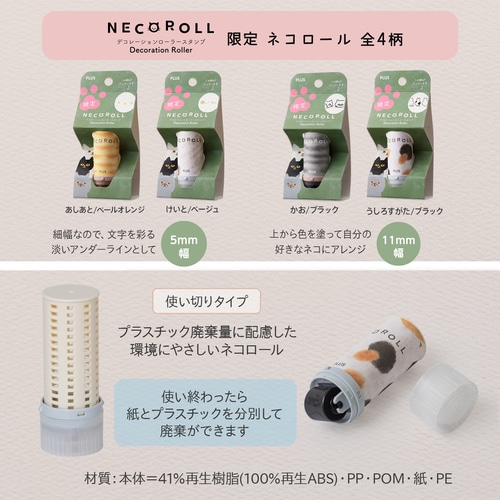 ●裏抜けしにくいインクを搭載。●5mm幅はインクが淡い色なので、上から文字を書いたり、デコロール複数柄やネコラッシュと組み合わせて使える。 ●11mm幅は、色塗りすると好きな種類の猫に変身。上から色塗りしてもにじみにくい。●ローラーは視認性が高く、引き始めを狙いやすい。 ●コンパクトなので、握りやすく、捺印しやすい。机の上でも場所を取らない。●ぬくもりを感じる紙ならではの質感。【検索ハッシュタグ】#デコロール#スタンプ#プラス#PLUS#新商品
