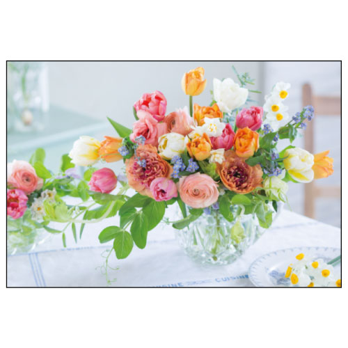 花それぞれの個性、やさしさを大切にするナチュラルなアレンジメントが人気のフラワーアーティスト落合恵美のポストカードです。